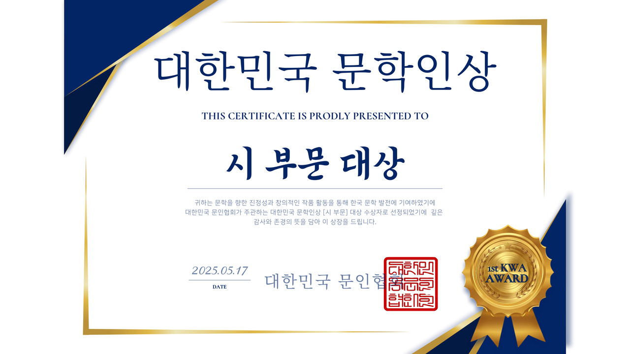 ‘대한민국 문학인 상’은 대한민국 문인협회가 주관하는 공식 문학상으로 시대의 정신을 글로 기록하고 문학의 가치를 지켜온 이들에게 수여되는 가장 권위 있는 상 중 하나입니다.